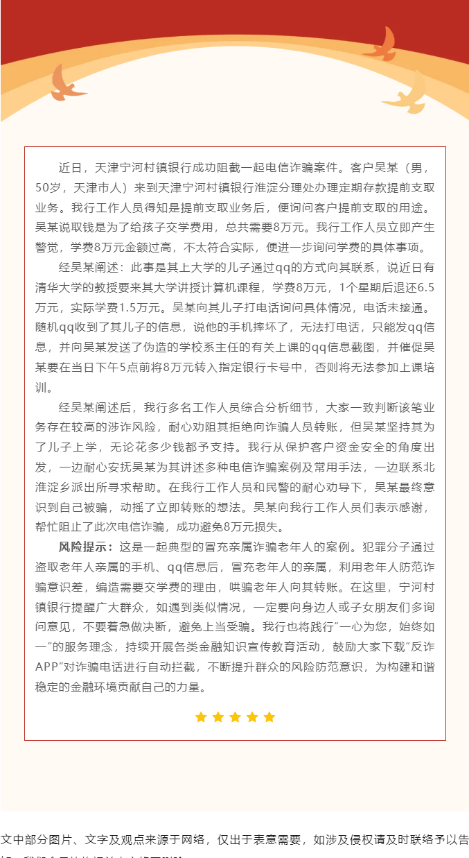 天津宁河村镇银行成功阻截一起电信诈骗案例